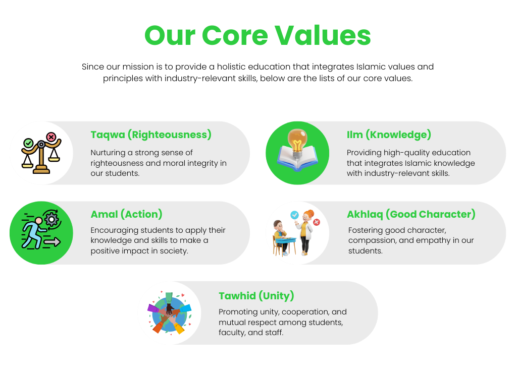 Empowering secondary school graduates with industry-relevant skills, knowledge, and experiences to succeed in their chosen careers and make a meaningful impact in their communities. To provide a holistic education that integrates Islamic values and principles with industry-relevant skills, empowering students to become knowledgeable, righteous, and responsible individuals who contribute positively to society